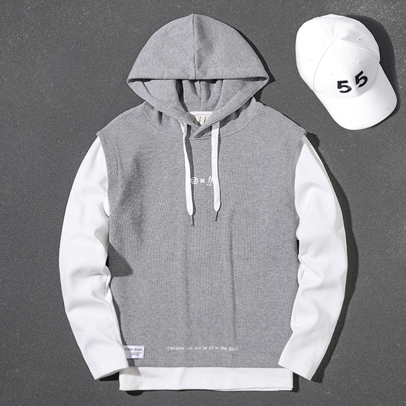 Handsome heavyweight gray fake two-piece 2023 spring, autumn and winter hooded large size top loose pullover long-sleeved sweatshirt for men