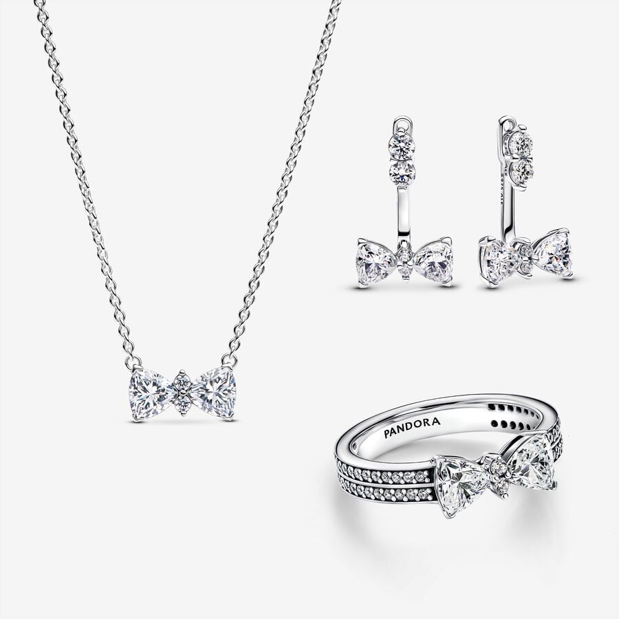 Brighten your style with the Sparkling Bow Jewelry Set, a charming trio of elegance and playfulness. This exquisite set features a matching ring, necklace, and earrings, all crafted in sterling silver with a delightful bow motif. The Sparkling Bow Double-Row Ring showcases a contemporary bow design surrounded by clear cubic zirconia. The necklace includes a sparkling bow-shaped centerpiece on an adjustable chain, while the earrings feature faceted stones forming a bow from a sparkling stud, with detachable jackets for versatile styling. Perfect for any occasion, this enchanting set is a wonderful gift for yourself or someone special!