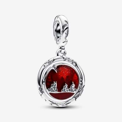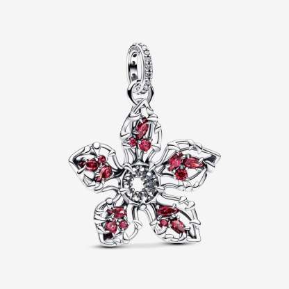 Stronger and stranger together. The nostalgic, pop style inspired set features six charms from the beloved Stranger Things universe. Glow-in-the-dark enamel lights up the Upside Down with a neon fairy light dangle charm, a darkly twisted sterling silver heart charm and a spinning dangle charm with an eerie touch. Crafted in red murano glass, each facet of the Hellfire Club dice charm is engraved with symbols of the clubhouse. Sparkling and fierce, the Demogorgon frightens as a flower-shaped dangle charm and as its monstrous human form. Each piece is a captivating symbol of the fan-favorite universe, styled on a Stranger Things clasp bracelet. Hand-finished in sterling silver.